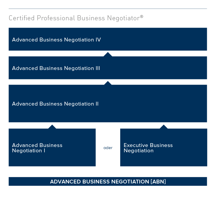 Lernen Sie in drei aufeinanderfolgenden Modulen unser offenen Seminarprogramme, schwierige Verhandlungen strategisch und taktisch zu führen. Mit der Zertifizierung erwerben Sie die Fähigkeit, komplexe Verhandlungsprozesse zu steuern, bewusst Sackgassen herbeizuführen, psychologisch ergebnisorientiert zu agieren sowie strategisch und taktisch schwierige Verhandlungen zu führen. Am Ende dieser Ausbildung erhalten Sie die Zertifizierung zum professionellen Verhandlungsführer.