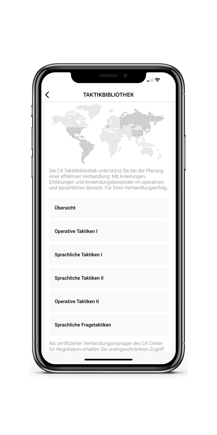 C4 Negotiation App jetzt mit Taktikbibliothek. Für unsere zertifizierten Verhandlungsmanager haben wir eine Taktikbibliothek freigeschaltet, die uneingeschränkten Zugriff auf Verhandlungstaktiken bietet, um Verhandlungen auf das Erreichen der gewünschten Ziele zu lenken. Planen Sie mit der C4 Negotiation App und unserer Taktikbibliothek inkl. erfolgreicher Taktiken und Techniken die effektivste Verhandlung. Mit Anleitungen, was wann und wie zu verwenden ist.
