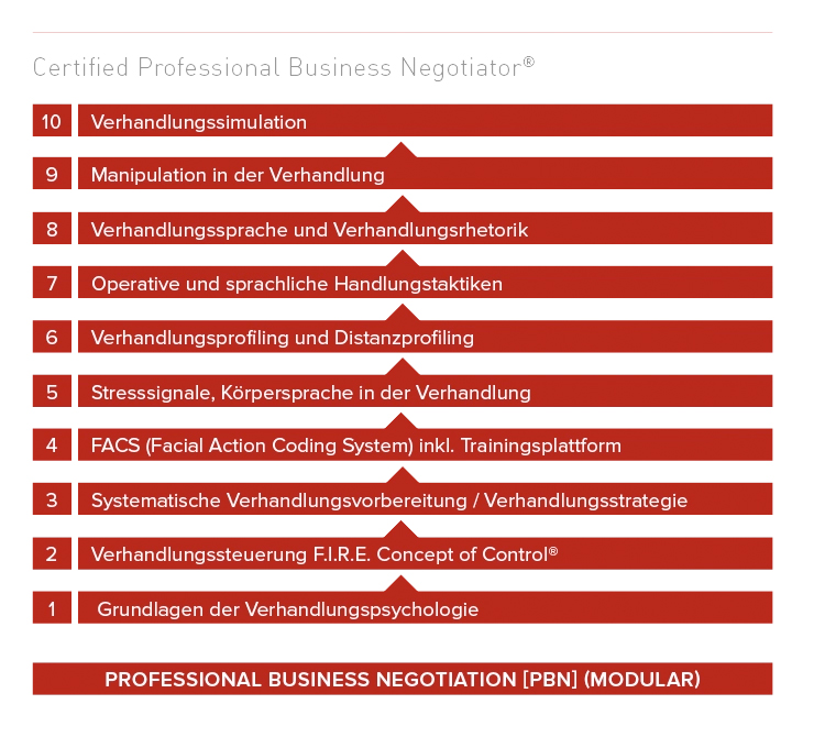 Mithilfe der Zertifikatausbildung erlangen Sie Klarheit über psychologische Muster in Verhandlungen. Sie lernen in den 10 Modulen eine erfolgreiche Strategie zu definieren sowie taktisch und zielorientiert zu verhandeln. Mithilfe der Behaviour-Analyse Ihres Gegenübers können Sie als „Certified Professional Business Negotiator“ durch wissenschaftlich abgesicherte non-verbale Signale Ihres Gegenübers erkennen, ob es sich um Täuschungssignale oder Hot-Spots handelt. Ein wichtiger Bestandteil Ihrer Ausbildung liegt darin, Ihr eigenes Verhandlungsprofil kennen zu lernen und sich flexibel auf andere Persönlichkeiten einstellen zu können. Zusätzlich sind Sie als „Certified Professional Business Negotiator“ in der Lage, eine Vielzahl fortgeschrittener als auch manipulativer Verhandlungstaktiken, die in den 10 Modulen bereits mit praktischem Bezug durch Übungen und Anwendungen simuliert wurden, zu erkennen und zu nutzen.